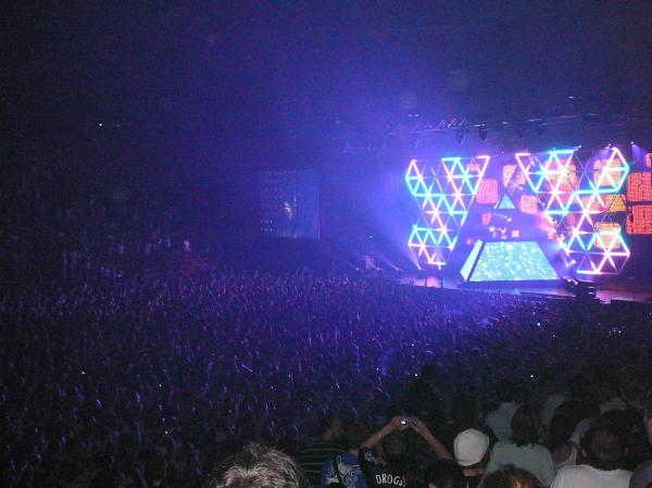Tout Bercy est debout, fosse ou gradins, VIP ou simple mortel, et ça danse, et ça transpire, c’est énorme ! Les tubes interplanétaires s’enchaînent, de « One More Time » 1er single de l’album « Discovery », à « Television rules the nation » (« Human after all », 2005), en passant par « Da Funk », « Around the world », « Technologic », « Harder, better, faster, stronger » bon c’est inutile de poursuivre, TOUS sont des tubes !!! En exacte harmonie, les effets visuels se succèdent sur des rythmes électro qui me plaisent décidément sans que je comprenne pourquoi je les distingue de cette vague techno qui n’a pourtant jamais trouvé grâce à mes yeux. Le live est d’une perfection technique et artistique éblouissante, tous les titres les plus marquants y sont intégrés et mixés incroyablement.