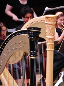 Donc mercredi soir, j’ai eu la chance d’être invitée par Sarah Jane à la Maison de la Radio pour la fête de la musique. Je ne sais pas comment vous avez vécu la votre par 35°, mais je crois que je n’aurais pas pu mieux tomber, dans cette salle d’autant plus somptueuse qu’elle s’est avérée être…climatisée. Quel bonheur ensuite de se régaler du spectacle de ces instruments tous plus beaux les uns que les autres, qu’ils soient à cordes – violons, altos, violoncelles et contrebasses, même deux harpes ! – ou à vent, avec leurs becs multiples, flûtes, clarinettes, bassons et hautbois, ou encore plus loin à droite les cuivres étincelants, cors, trompettes, trombones, et tuba, encadrés, tout au fond cette fois par les percussions, tambours, cymbales … et l’irremplaçable triangle !