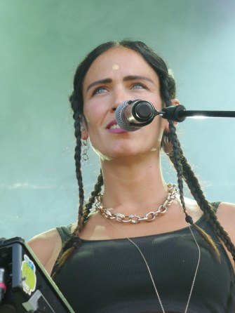 La jeune femme, en short de boxeuse et brassière de sport, longs cheveux noirs tressés et tatouages multiples, est seule sur scène avec son sampleur et son musicien au synthé. Pleine d’énergie, elle danse beaucoup et chante en anglais ou en espagnol. Entre deux titres, elle explique qu’elle est moitié française (elle a grandi à Paris, à Belleville) et moitié vénézuélienne, et dédicace un morceau à sa famille restée en Amérique du Sud, qui vit dans des conditions très différentes. Elle le dit très simplement, sans misérabilisme, tout en faisant passer un message clair ; et ça nous plaît !