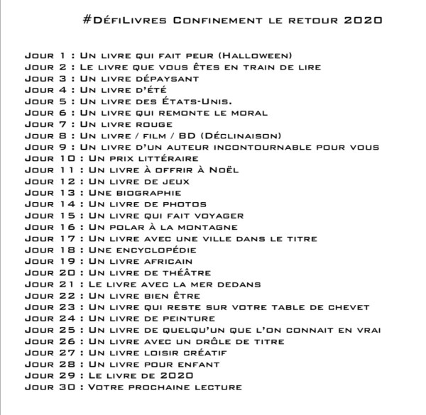 Mon amie Marie a relancé sur son blog le #DéfiLivres du 1er confinement, histoire d’accompagner un peu le nouveau >>> https://mhfleblog.com/2020/10/31/defilivres-confinement-le-retour-2020/
