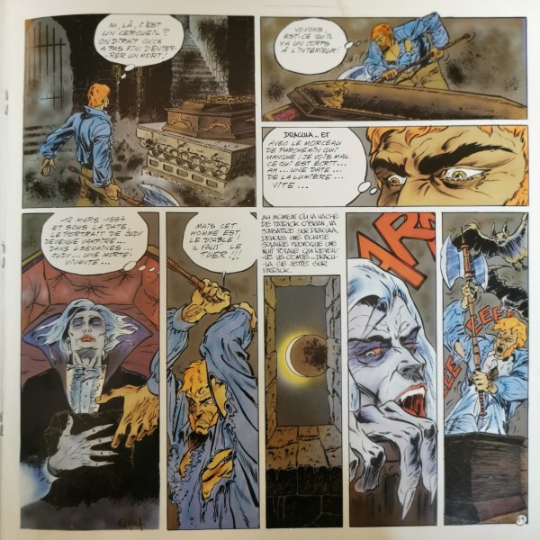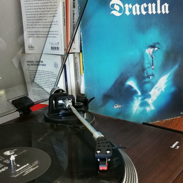 Mais Dracula, c’est aussi et surtout ce livre-disque de 1981, qui faisait frissonner mes petits frères. Étant plus âgée, la narration et les nombreux bruitages (les battements d’ailes de chauve-souris, l’éclatement de la jarre des âmes, le bruit des dents qui dévorent, et j’en passe), n’avaient pas le même effet sur moi ; cela m’amusait plutôt. Ces séances d’écoute et de lecture, sur fond de musique hyper kitsch, années 80 obligent, restent un excellent souvenir de moment partagé en famille.