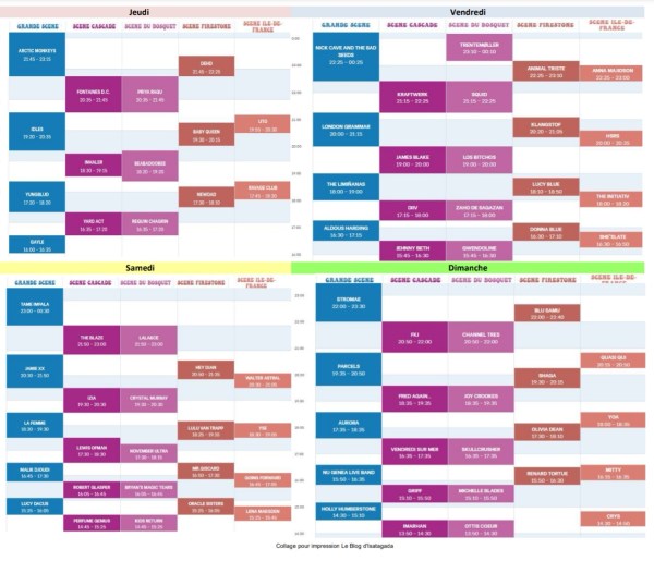 Le site de Rock en Seine s’est enrichi et propose une grille de programmation qui me dispense désormais de passer des heures à vous trafiquer un programme papier à emporter. J’ai quand même refait un petit collage photo à consulter hors connexion. Vous avez la version qui regroupe les 4 jours sur une seule photo, ou bien en 2 fois (jeudi et vendredi, puis samedi et dimanche). Servez-vous !
