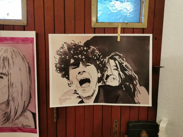 Outre ses « petites bonnes femmes » que j’aime au point que je suis devenue propriétaire de l’un de ses tableaux, Cat réalise aussi des portraits pour ses proches ou sur commande, ainsi que des portraits d’artistes. Elle y excelle.