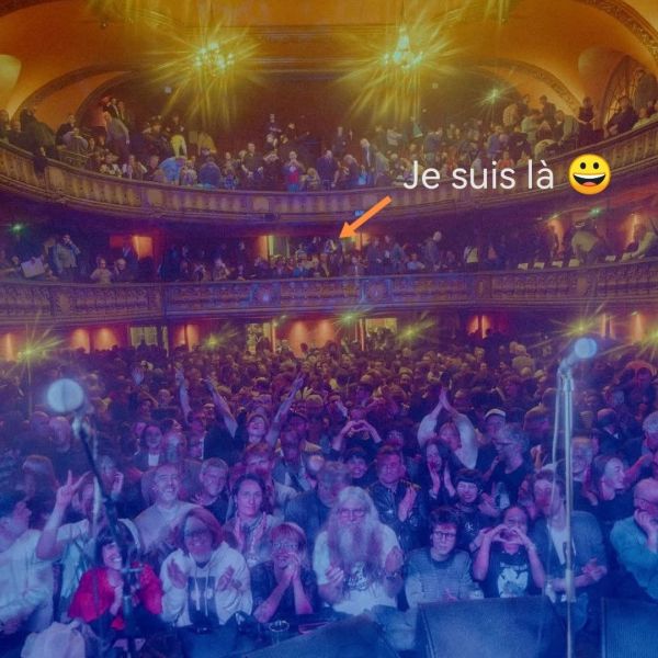 PS : Je me suis retrouvée sur cette photo avec mon chéri, postée par l’artiste sur sa page Facebook, la petite blonde debout au dernier rang du 1er balcon (même si on ne voit que notre légendaire Gilles, au 1er rang de la fosse, cela va sans dire 😁). Merci Sharon !