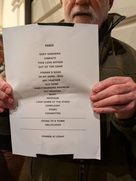 Set List : GREY GARDENS, VIBRATE, THIS LOVE AFFAIR, OUT OF THE GAME, MES JOIES RÉPÉTITIVES, IN MY ARMS, THE ART TEACHER, OLD SONG, EARLY MORNING MADNESS, GAY MESSIAH, WANT, MONTAUK, LOOK DOWN AT THE STARS, LA COMPLAINTE DE LA BUTTE, POSES, CIGARETTES & CHOCOLATE MILK, GOING TO A TOWN, HALLELUJAH, DINNER AT EIGHT
